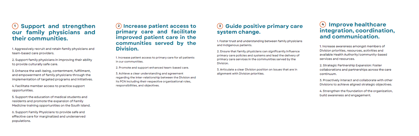 The South Island Division of Family Practice is thrilled to launch the first part of our new Strategic Plan. This phase identifies our strategic priorities and key goals designed to drive impactful success. Over the coming months, we’ll provide a deeper look into the specific actions we’re taking that will drive meaningful change in our communities.